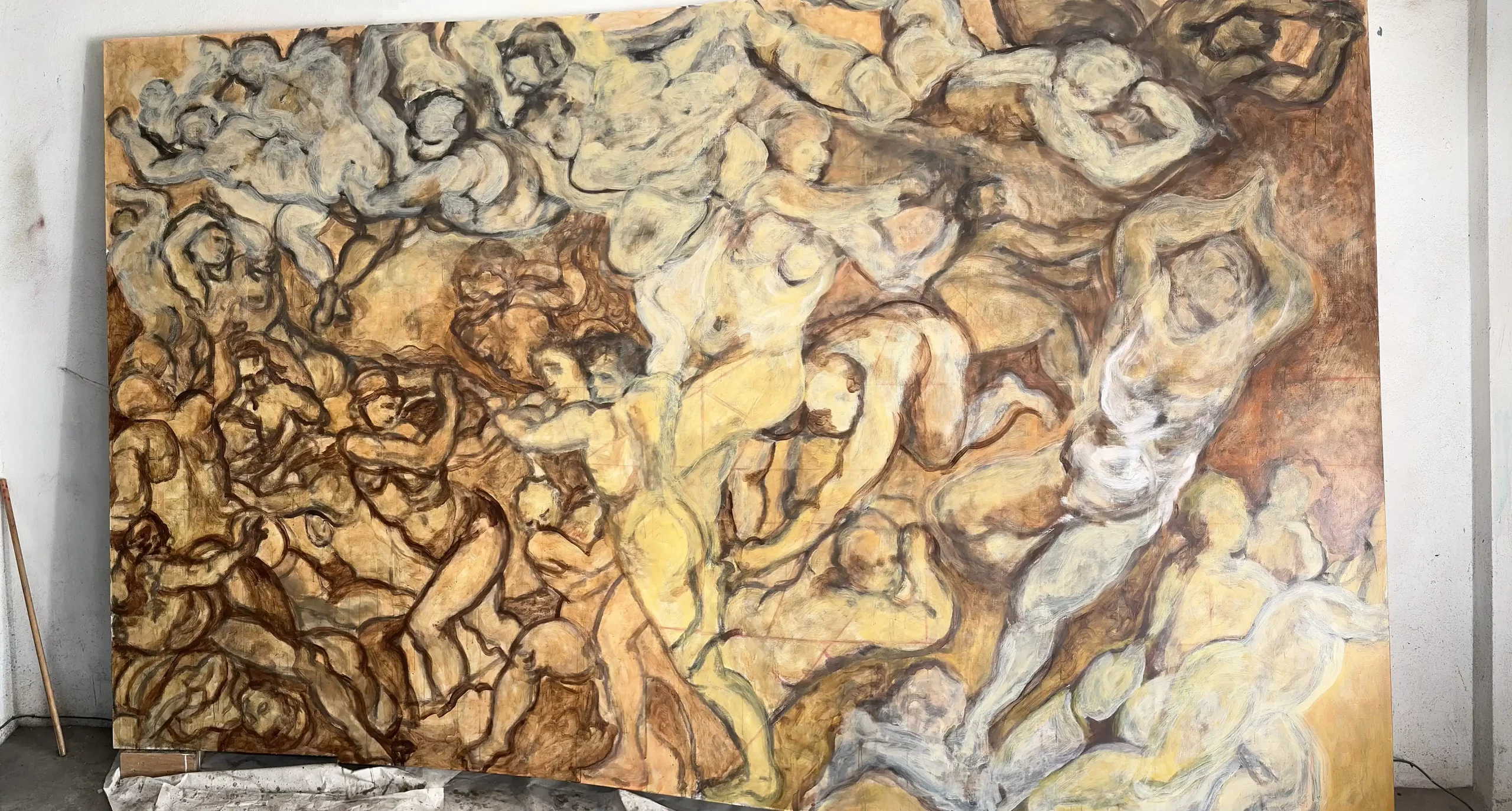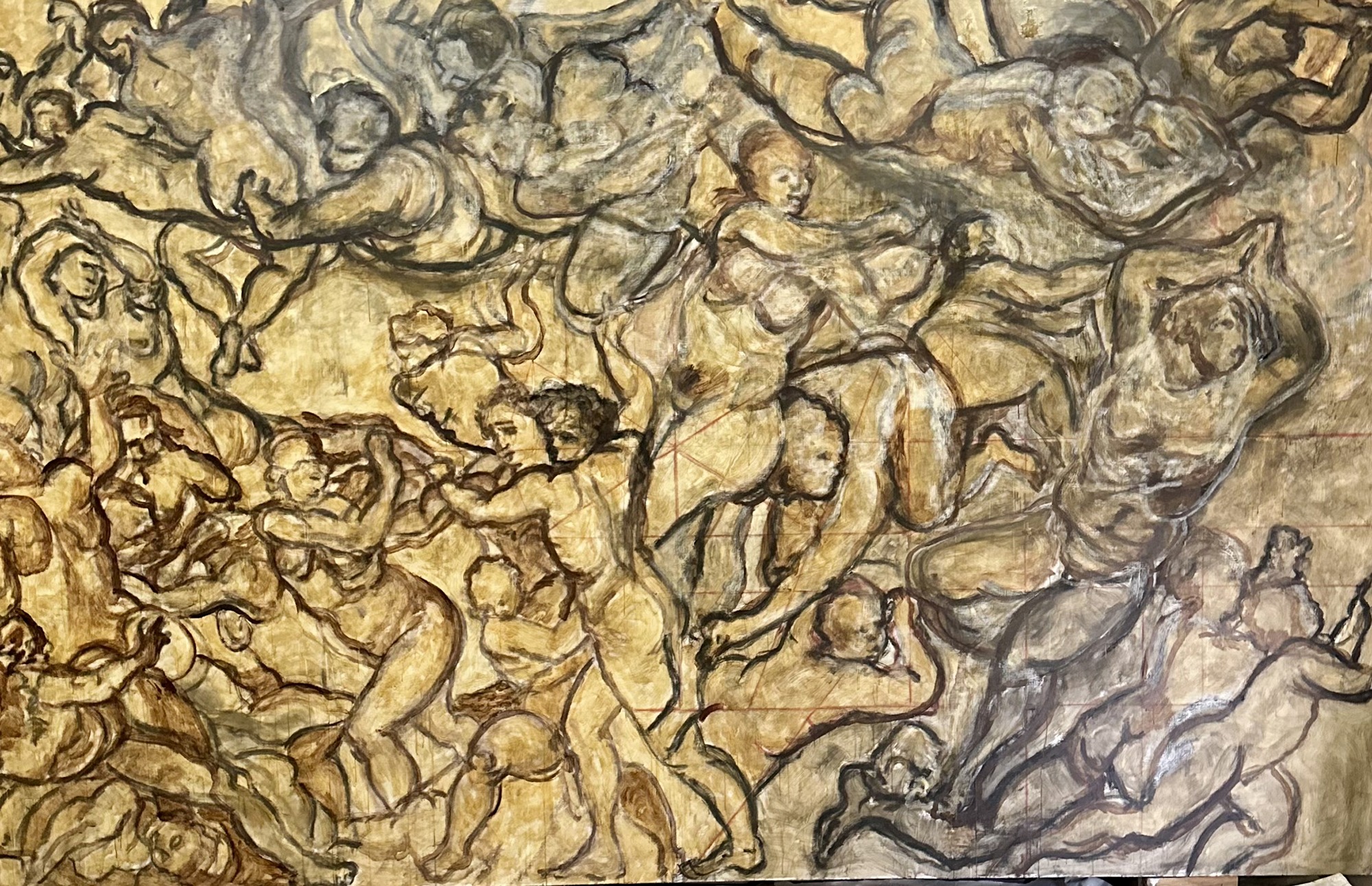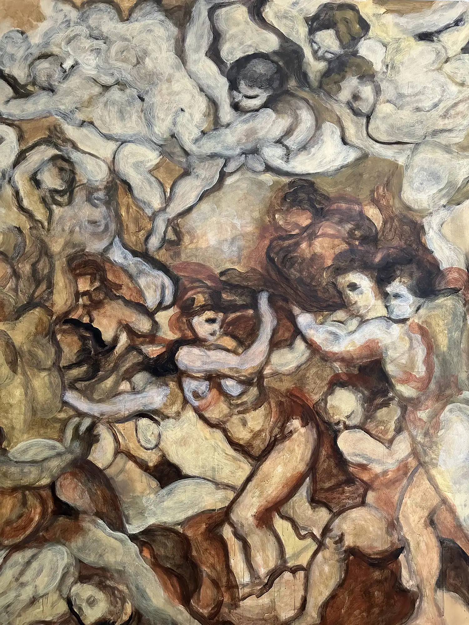 De nuevo, hago referencia a dos de los bocetos del artista, uno de 1565 titulado “The Virtues and Blessings of Matrimony Expelling the Vices and Ills” y otro, “Putti” de 1548, para construir una nueva concepción del colectivo, en la cual cada cuerpo no se encuentra en un único punto de tensión en una lucha solitaria, sino que existe la posibilidad de una experiencia compartida de devenir, como lo evidencia la fusión intencional de cuerpos, pinceladas y colores, así como la no existencia de separación total ni indicadores esencialistas de géneros del todo aparentes. La obra intenta evocar una danza post-individualista suspendida en el tiempo, guiando la mirada en un viaje por el lienzo con una invitación visual a evitar las estrictas separaciones de forma que construyen el canon original.