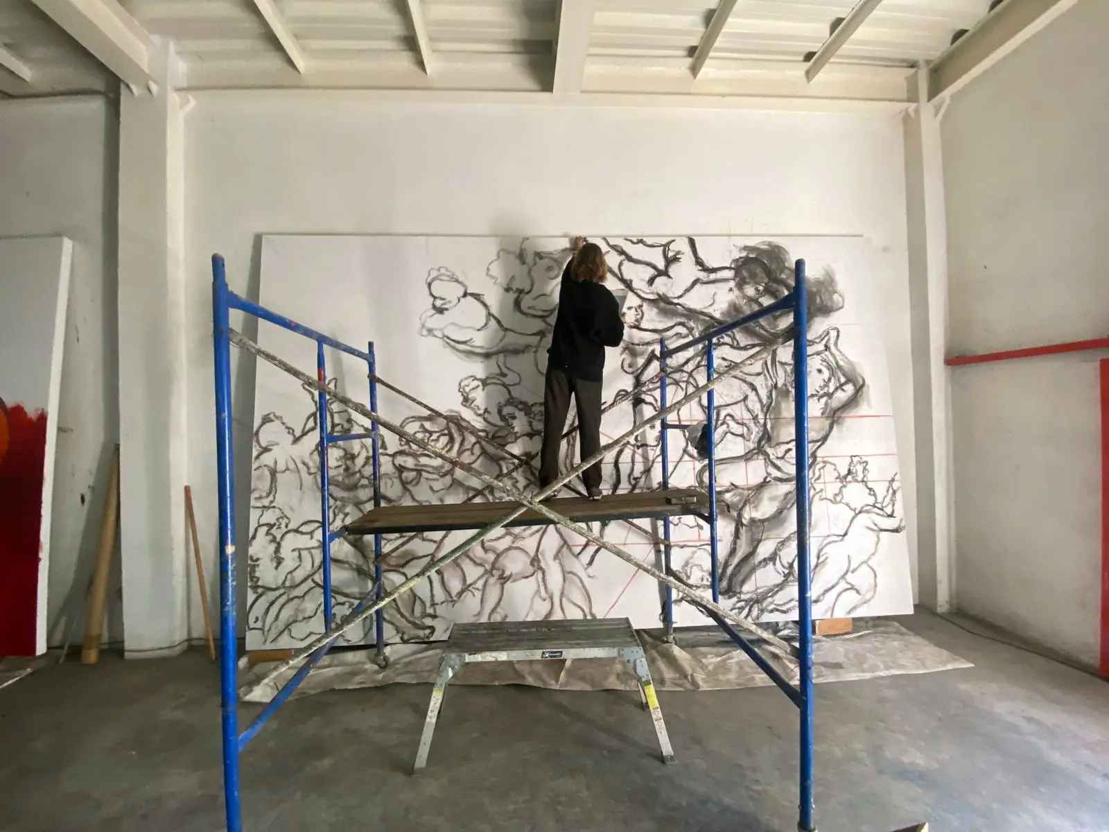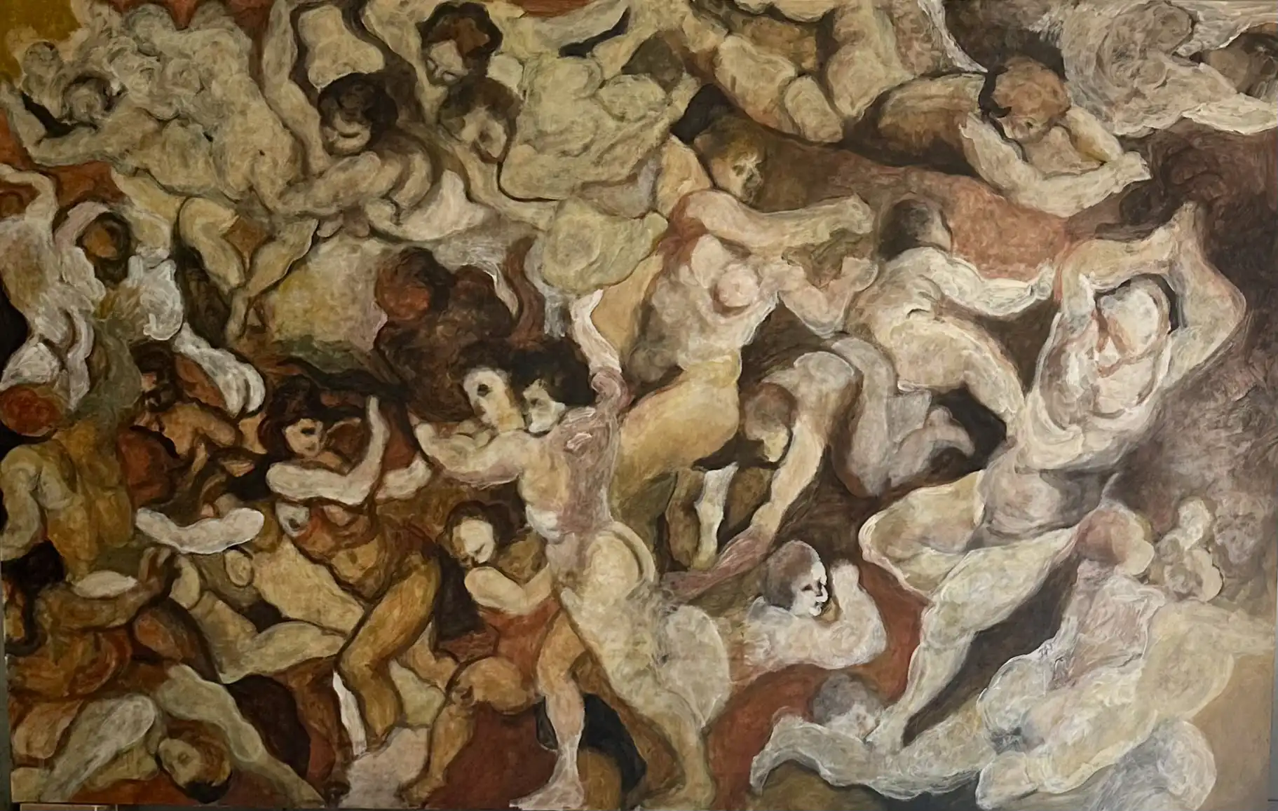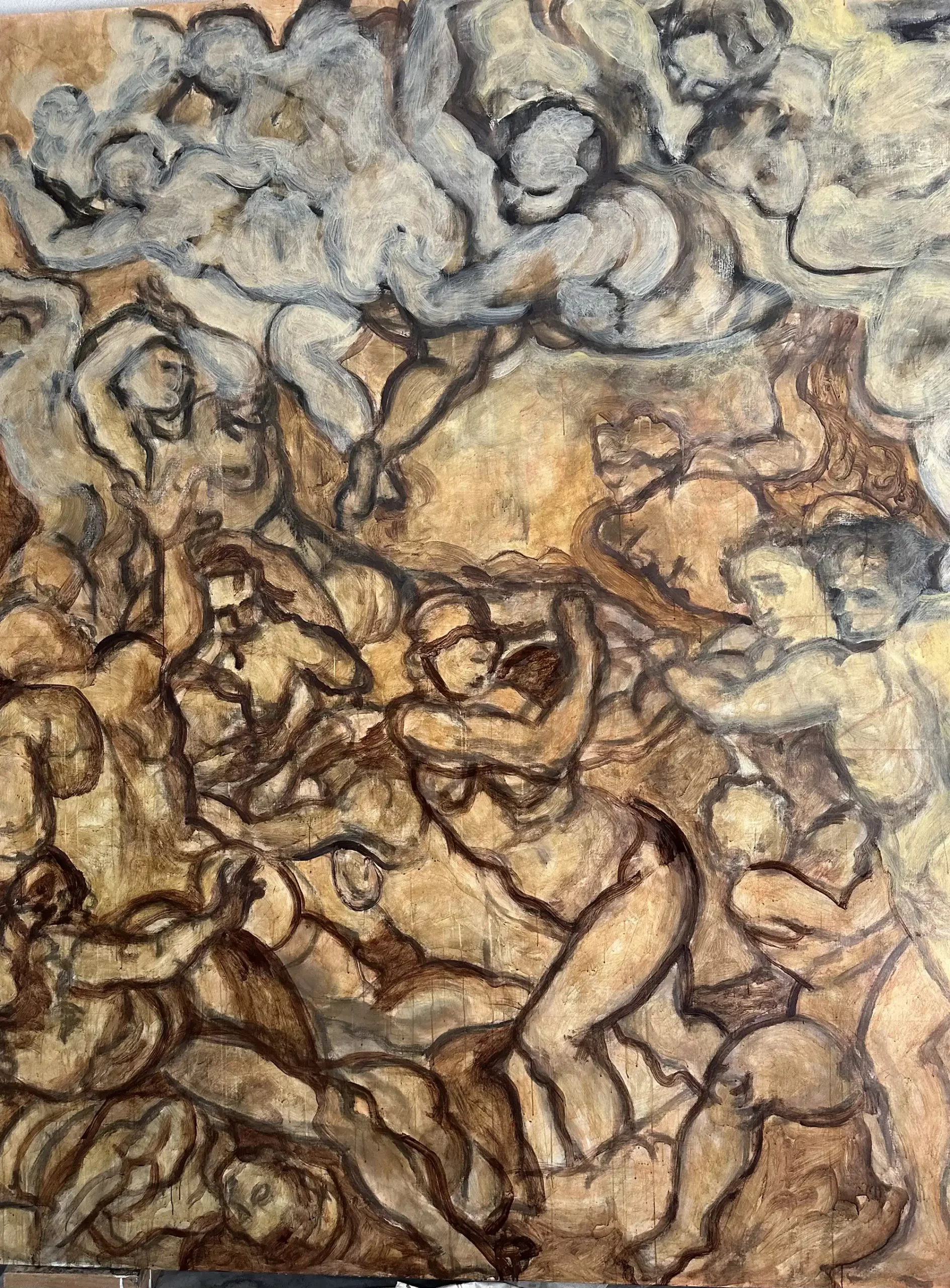 De nuevo, hago referencia a dos de los bocetos del artista, uno de 1565 titulado “The Virtues and Blessings of Matrimony Expelling the Vices and Ills” y otro, “Putti” de 1548, para construir una nueva concepción del colectivo, en la cual cada cuerpo no se encuentra en un único punto de tensión en una lucha solitaria, sino que existe la posibilidad de una experiencia compartida de devenir, como lo evidencia la fusión intencional de cuerpos, pinceladas y colores, así como la no existencia de separación total ni indicadores esencialistas de géneros del todo aparentes. La obra intenta evocar una danza post-individualista suspendida en el tiempo, guiando la mirada en un viaje por el lienzo con una invitación visual a evitar las estrictas separaciones de forma que construyen el canon original.
